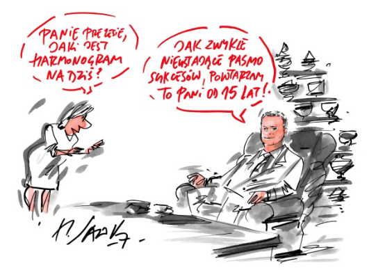 Rysunek 8073 – w jednym dymku dopisanie imienia Tomku i inne sformułowanie: Jaki mamy plan na dziś, Tomku? – w drugim dymku też zmiana formuły oraz daty – skoro są na ty może warto żeby on jej odpowiedział: Jak zwykle nieustające pasmo sukcesów, powtarzam to Krysiu od 30 lat! + logo firmy DEVELEY 30 LAT na wizytówce / tabliczce lub na ścianie.