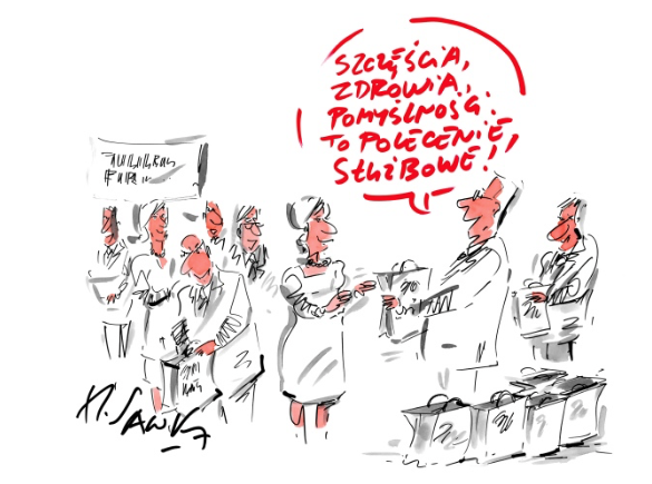 Rysunek 3086 – przerysowanie go tak aby w gabinecie firmowym przy stole konferencyjnym siedziały po jednej stronie kobiety a po drugiej panowie i szef mówi: